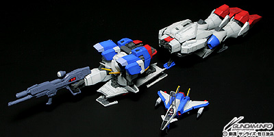 ▲コアスプレンダー、チェストフライヤー、レッグフライヤーの3機の合体を再現。チェストフライヤーとレッグフライヤーは、着陸時に使用するランディングギアのギミックをこのキットのために新たに設定している。ランディングギアは差し替え式だ。