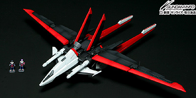 ▲付属のシルエットフライヤーと合体してフォースシルエットとなる。シルエットフライヤー単体も、翼は先端が0.3ミリの厚みで成形されているなど精密感が高い。専用ベースを使うことで格納状態も再現できる。1/100スケールのシンとルナマリアのフィギュアも付属する。