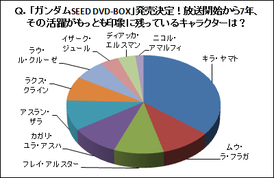 「Q.ガンダムSEED DVD-BOX」発売決定!放送開始から7年、その活躍がもっとも印象に残っているキャラクターは?」はキラ・ヤマトが1位!【2009年11月23日~2009年11月29日】