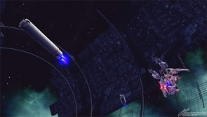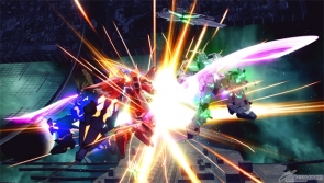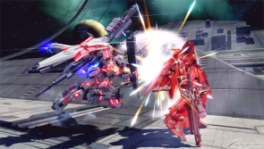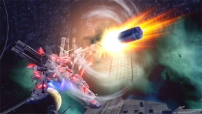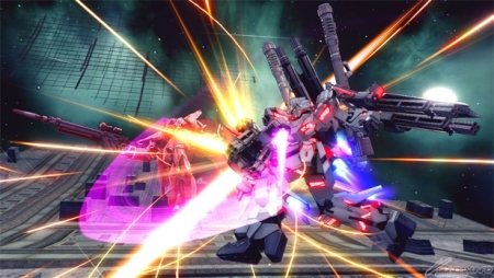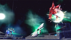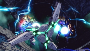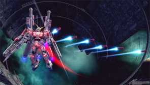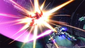 ▲特殊格闘武装「サイコフレームの共鳴」では、各種武装をパージし、自機周辺に敵を痺れさせる光を発し、同時にシールドが飛び立ちビーム・ガトリングガンを連射した後で体当たりを行う。