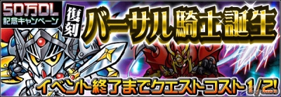過去に開催されたイベント「バーサル騎士誕生」が復刻!50万DLを記念して、イベント終了までコスト1/2キャンペーンを実施!