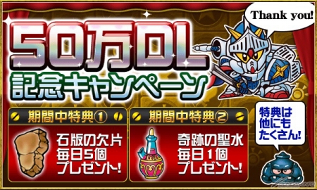 期間限定で「石版の欠片5個」と「奇跡の聖水1個」が毎日もらえる無料プレゼントキャンペーンや、新レアリティのレインボー枠に「スペリオルドラゴン」が追加された「50万ダウンロード記念ガシャ」など、イベントが目白押しとなっている。