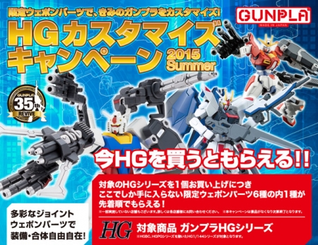 ガンプラHGシリーズを購入すると限定ウェポンパーツがプレゼントされる「HGカスタマイズキャンペーン2015 Summer」は、7月25日(土)より全国模型取扱店にてスタートする。