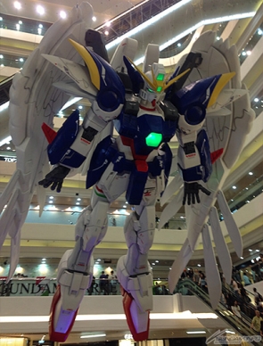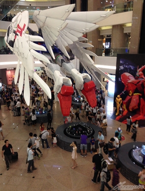 ▲吹き抜けでは全高約8mの巨大な「ウイングガンダムゼロ(EW版)」を空中展示!