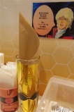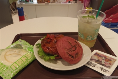▲「トマトバーガー~シャアザクバーガー~」と「ハロドラ」、ガンダム展フェアの「砂の十字架~『水を飲ませてくれませんか』~」をいただきます!壁や小物類にも注目!グッズコーナーも充実しています!