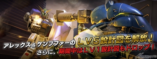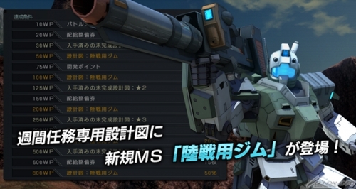 キャンペーン期間中は、週間任務の報酬として地球連邦軍の新規MS「陸戦用ジム」のLV1設計図が入手可能となるほか、戦闘報酬として「アレックス」と「ケンプファー」のLV1設計図もドロップするようになる。