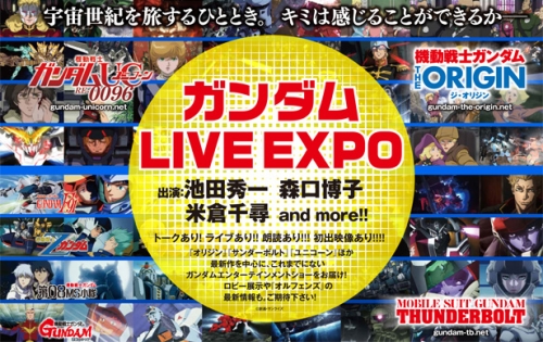 ガンダムLIVE EXPOは、ガンダムシリーズの最新作を中心に、これまでにないガンダムエンターテインメントショーをお届けしていくというもので、声優の池田秀一さんをはじめ、アーティストの森口博子さん、米倉千尋さんなどの豪華ゲストが出演。トークやライブ、朗読が繰り広げられるほか、初出映像や最新情報のお披露目、ロビー展示なども予定されている。