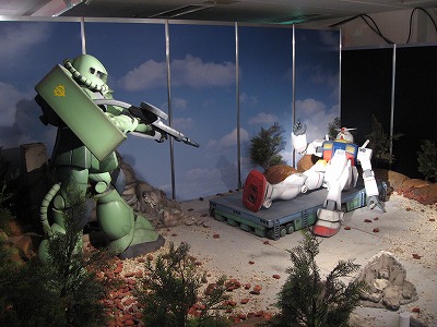 ▲会場に入るとまずは「アムロVSシャア 巨大ジオラマゾーン」。上のシーンやガンダムvsジオングなどの名シーンを大迫力の巨大ジオラマで再現しているのだ。