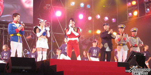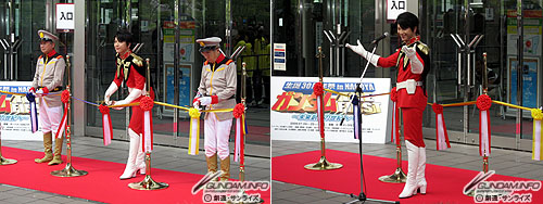 オープニングセレモニーに登場したのは、レビル将軍とエルラン中将、そしてシャア!? その正体はメ~テレの堀社長と『機動戦士ガンダム』のプロデューサーを務めた関岡氏、そして「メ~テレ★ガンダム THE FIRST 親善大使」及川光博さん。社長、気合入ってます。