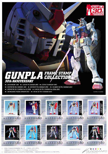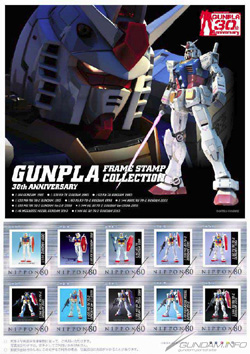 ガンプラ30周年を記念して発売されるこのオリジナルフレーム切手は、バンダイの「ガンプラ」を題材としており、1980年に発売された初代「1/144 ガンダム」から、最新ブランド第1弾「1/144 RG RX-78-2 ガンダム」までの歴代ガンプラがデザインされ、オリジナルデザインの台紙とファイルバックとともに限定5,000セットが販売される。