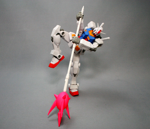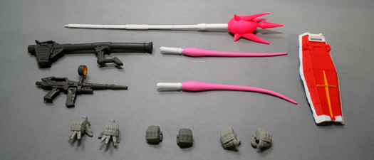 ガンダムには、シールド、ビーム・ライフル、ハイパー・バズーカ、ビーム・ジャベリン、ビーム・サーベルといった豊富な武装のほか、交換用の手首が付属。