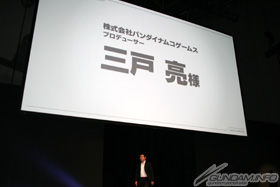 まずはゲームの発売元となるバンダイナムコゲームスのプロデューサー・三戸 亮氏が登壇し、「ガンダムAGE」はもう一度子供たちを夢中にさせ、“新しいガンダム世代”を作ることを目指しているということ。そしてゲームとアニメが連動した様々な企画を展開することで、既存のアニメファンだけでなく幅広い年齢層をターゲットにしていくという本作のコンセプトを紹介。
