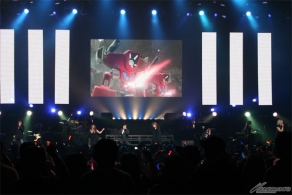 ▲水木氏のオープニングライブ。「空飛ぶマジンガーZ」が披露され会場のボルテージが一気に上がった。ステージでは、なんと水木氏が宙を舞う演出が行われ、空中に大きな「Z」の文字を描いた。