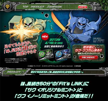 株式会社ロッテより『機動戦士ガンダム』に登場する「ザク」、「グフ」とコラボレーションしたパッケージの「Fit’s LINK」が、本日4月16日から発売されることを記念して、オリジナル壁紙がプレゼントされる「壁紙プレゼントキャンペーン」が、「Fit’s LINK ザク&グフ」特設サイトにて開始された。