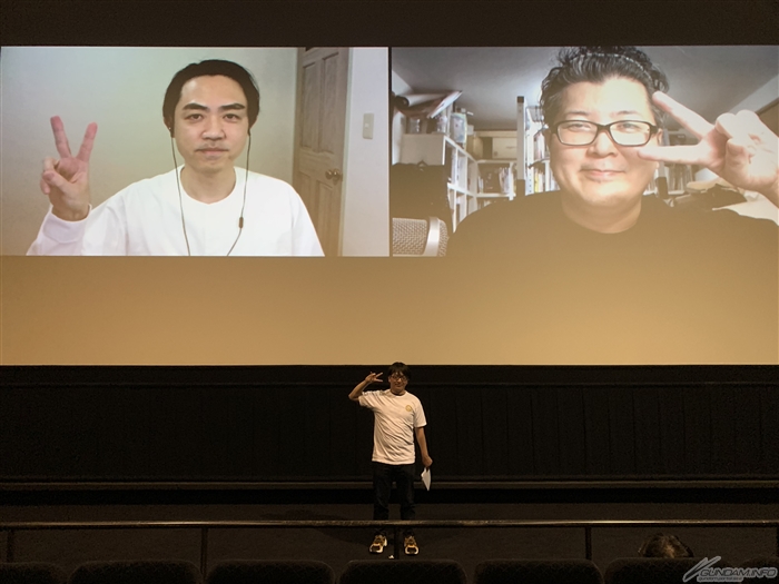 安田さんと形部さんはそれぞれの仕事場からリモート参加ということで、壇上には仲プロデューサーひとりが立ち、劇場のスクリーンに2人の顔が見えるような形でスタッフトークがスタート。