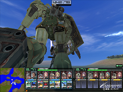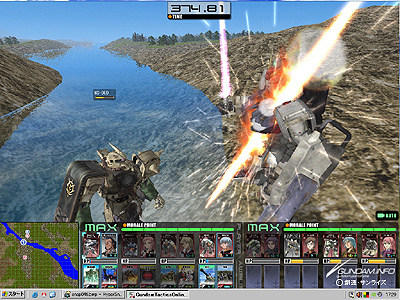 このゲームは編制を決めてプレイをスタートすると、3Dのモビルスーツがバトルを繰り広げる。しかも、戦況を見て、クリックひとつで特殊アイテムを使用を発動できる。