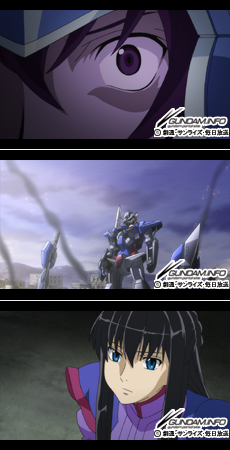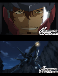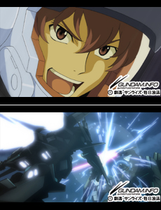■ロックオンVSグラハム ユニオンによる軍事支援で出兵していたグラハムは、太陽光受信アンテナ設置現場でデュナメスを発見し、交戦する。グラハムが巧みに操縦するフラッグカスタムにロックオンは苦戦を強いられる。 |