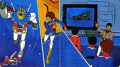 ▲ホワイトベースの第2艦橋(……ではないと思うが)でブライトはアムロに出撃命令を下した。ガンダムはシールドをランドセルに装着して出動。本文中ではほとんどの場面でシールドは背面に付けられたままである。