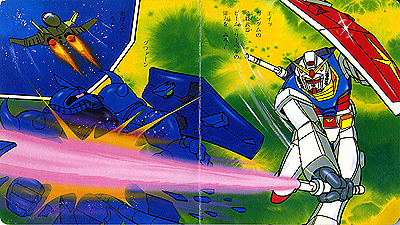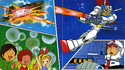 ▲ビーム・スプレー・ガンの直撃で、シャアのムサイ艦はあっさりと撃破!? カツ・レツ・キッカはアムロを応援する。それにしても3人の背景のモチーフは初期アイキャッチっぽい気が……。
