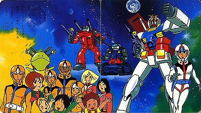 ▲ラストシーン。地球をバックにホワイトベースのクルーが総登場。フラウ・ボウだけ私服なのはなぜなのか? よく見ると、彼女だけ等身が違うような気もするし……。