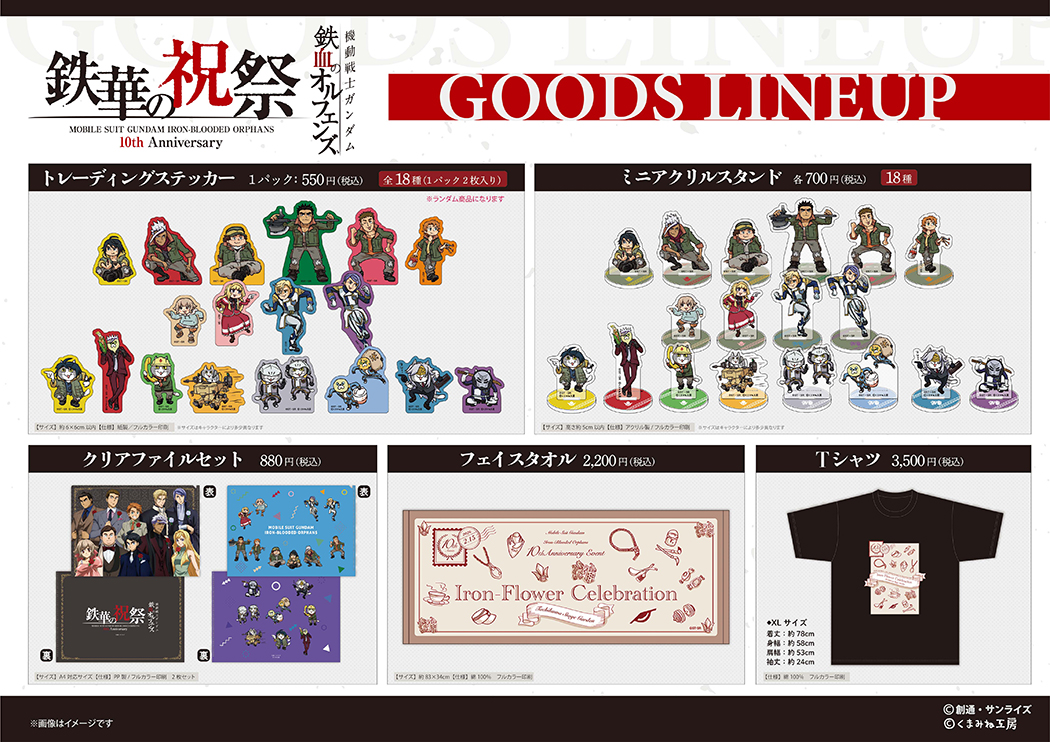 さらに、キャラクターデザイン・千葉道徳さんによるイベント描き下ろしイラストを使用したグッズの他、ムジーナ、電話猫や仕事猫等で著名なイラストレーター、くまみねさんと『鉄血のオルフェンズ』のコラボが実現し、くまみねさん描き下ろしのディフォルメイラストや仕事猫コラボイラストを使用したグッズも登場!