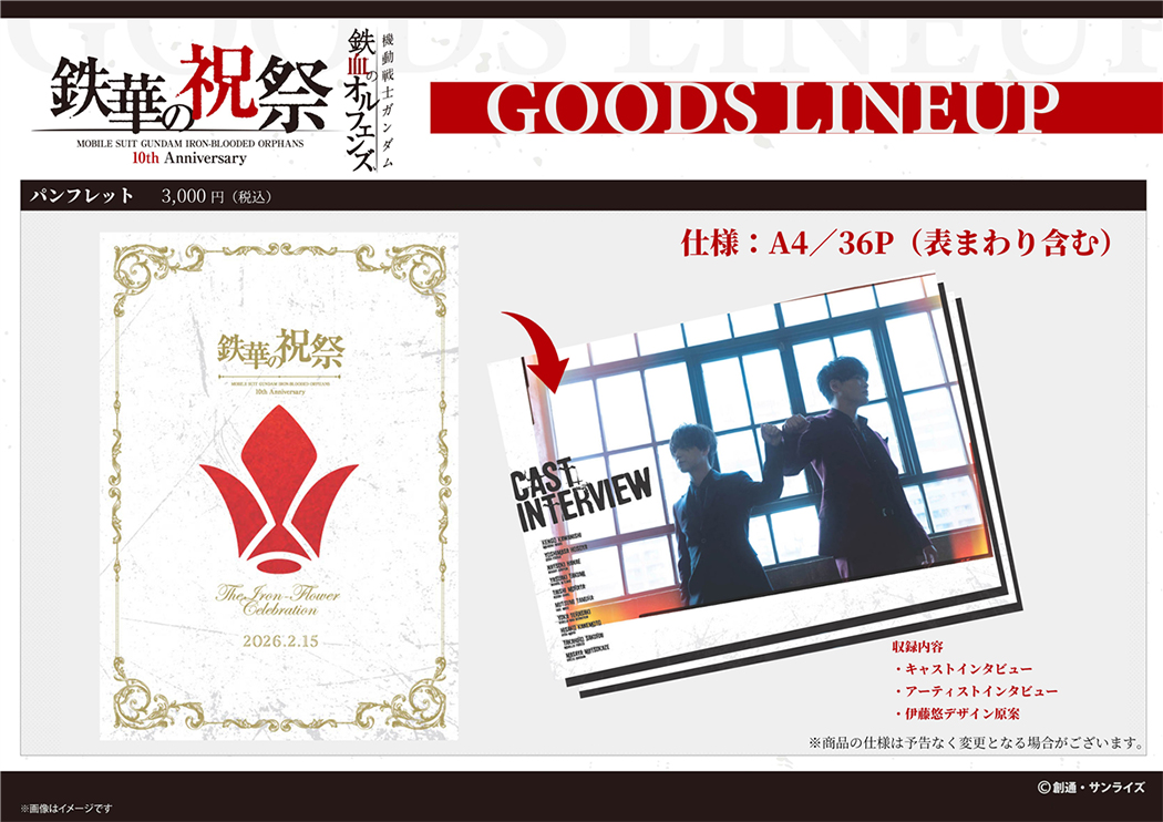 イベントパンフレットは、三日月・オーガス役の河西健吾さんとオルガ・イツカ役の細谷佳正さんの撮り下ろしフォトと共に、本イベント出演者総勢10名のキャストインタビュー、さらに横山克さん、SPYAIRのMOMIKENさんとYOSUKEさんのアーティストインタビュー、イベントキービジュアルの各キャラクターの装いの原案となった、伊藤悠さんによるデザイン原案等を掲載した36ページに及ぶ豪華内容!
