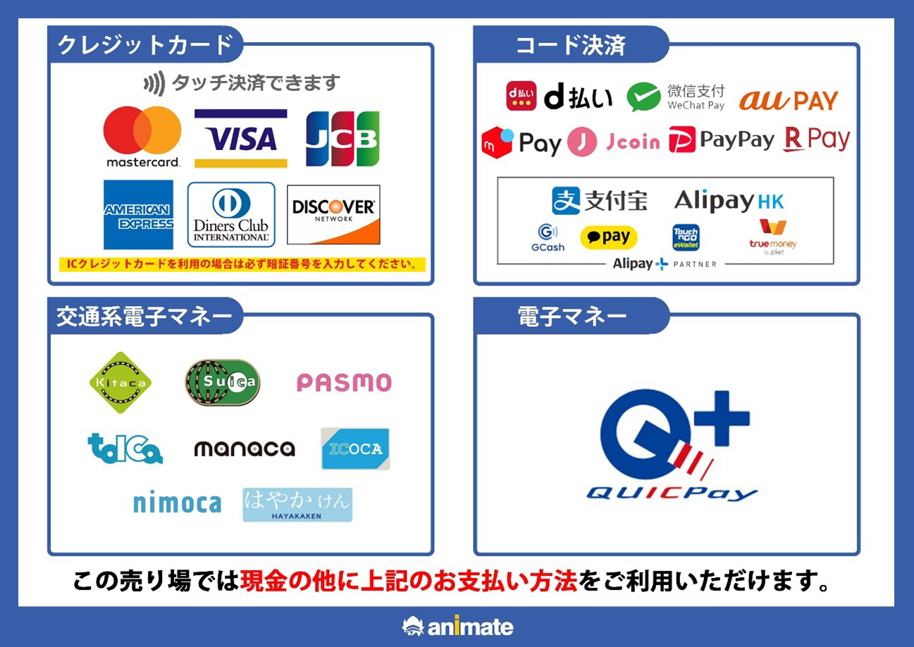 ※クレジットカード、交通系電子マネーでのお支払いは現金でのお支払いより決済にお時間をいただくことがございます。また、当日、やむを得ない事情により、ご使用頂けない場合がございます。予めご了承ください。