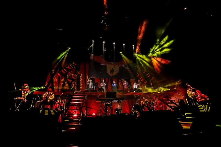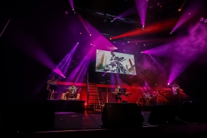 鉄華団を象徴する赤色のサインライトで来場者が出迎える中、音楽・横山克さんを中心としたバンドがテーマソング「Mobile Suit Gundam: Iron-Blooded Orphans」を演奏。本日出演するキャスト陣がドレスアップした姿で登場し、一礼したあと、イベントは開幕した。