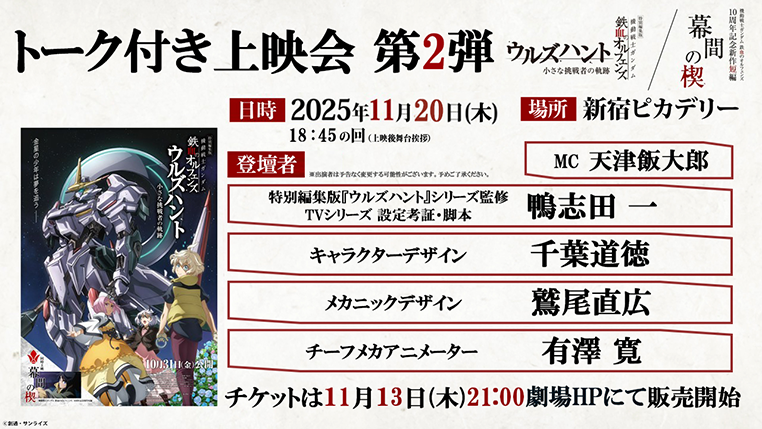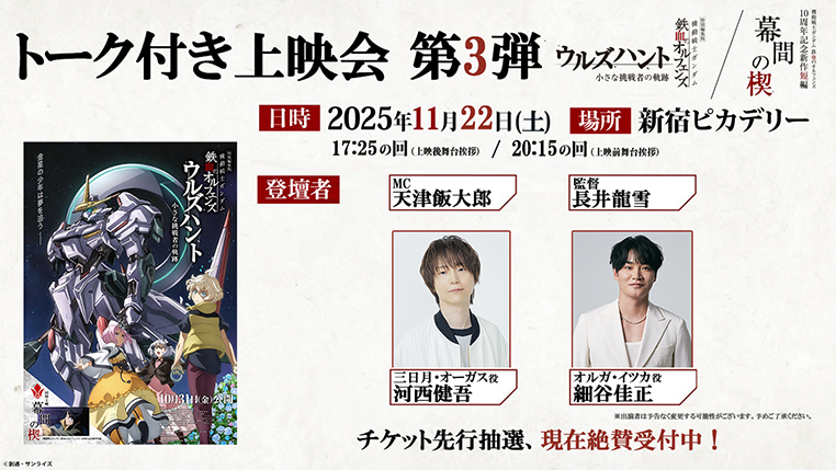 特別編集版『機動戦士ガンダム 鉄血のオルフェンズ ウルズハント -小さな挑戦者の軌跡-』/『機動戦士ガンダム 鉄血のオルフェンズ』10周年記念新作短編「幕間の楔」の公開を記念し、「トーク付き上映会」の第2弾と第3弾の開催が決定いたしました!