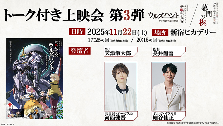 特別編集版『機動戦士ガンダム 鉄血のオルフェンズ ウルズハント -小さな挑戦者の軌跡-』/『機動戦士ガンダム 鉄血のオルフェンズ』10周年記念新作短編「幕間の楔」では、TVシリーズのキャラクター達が登場する「映画館」をテーマにした特典映像が、本編上映前に週替わりで上映されます。