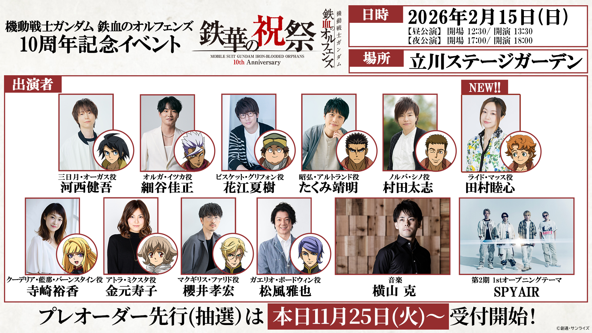 2026年2月15日(日)に立川ステージガーデンにて行われる、『機動戦士ガンダム 鉄血のオルフェンズ』10周年記念プロジェクトのフィナーレイベント「機動戦士ガンダム 鉄血のオルフェンズ 10周年記念イベント -鉄華の祝祭-」のチケットプレオーダー先行(抽選)が本日11月25日(火)より受付開始!