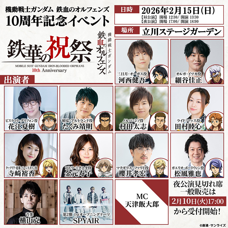 2026年2月15日(日)に立川ステージガーデンにて行われる「機動戦士ガンダム 鉄血のオルフェンズ 10周年記念イベント -鉄華の祝祭-」夜公演見切れ席チケットの一般販売(先着)が、2月10日(火)17:00よりスタートします!