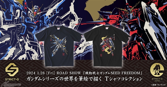 「STRICT-G JAPAN 劇場版『機動戦士ガンダムSEED FREEDOM』筆絵風Tシャツ」2種が、1月27日(土)より、ガンダムの世界観を取り入れたアパレルショップ「STRICT-G」で発売される。価格は各5,830円(税込)。
