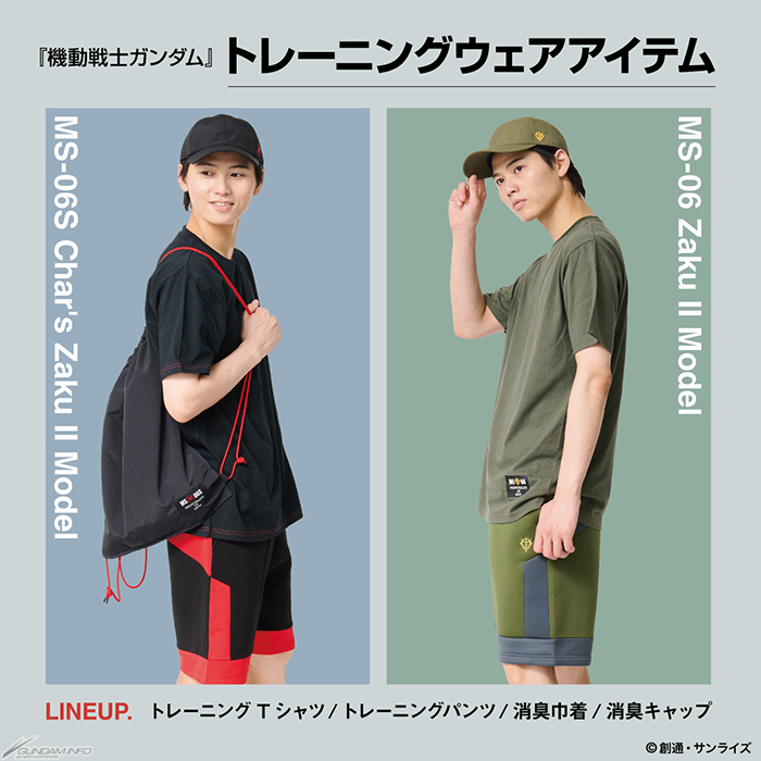 『機動戦士ガンダム』よりシャア専用ザク・量産型ザクをそれぞれモチーフにしたトレーニングウェアアイテムが登場。消臭巾着、消臭キャップ、吸水速乾Tシャツ、トレーニングパンツの4アイテムがラインナップする。