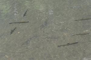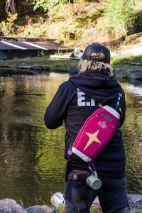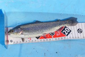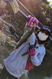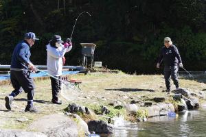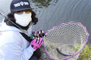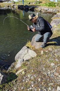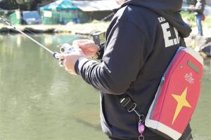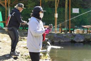 すると、すぐにサンライズチームが23cmのニジマスをゲットし、幸先の良いスタートを切る。強い力を入れる必要なく、軽い動作で狙ったポイントにしっかりルアーを落とすことができるので、投げては巻き、巻いては投げの動作をスムーズに続けられる。その後も2人で次々と、面白いように魚を釣り上げてゆく。