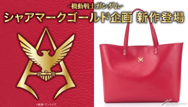今回は、「トートバッグ」がラインナップし、エンジの合成皮革に「シャアマーク」のゴールドのパーツがついた高級感のあるデザインとなっている。