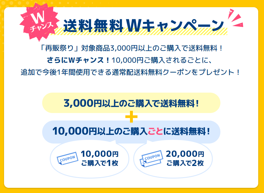 さらに、対象の”再販アイテム”を購入した人を対象に「送料無料Wキャンペーン」も実施中。
