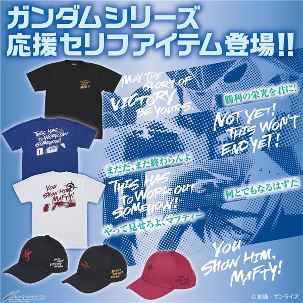 本企画は、ガンダムシリーズに登場する背中を押してくれるようなセリフを英字でデザイン。シャア・アズナブルの「勝利の栄光を君に」、クワトロ・バジーナの「まだだ、まだ終わらんよ」、ハサウェイ・ノアの「何とでもなるはずだ」、ガウマン・ノビルの「やってみせろよ、マフティー」を、ライトTシャツとキャップに落とし込んでいる。