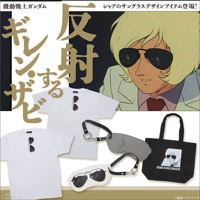 『機動戦士ガンダム』より、「坊やだからさ」のセリフで有名な名シーンで、シャア・アズナブルが着用していたサングラスをモチーフにした、「Tシャツ」「トートバッグ 」 「パスケース」がラインナップ。