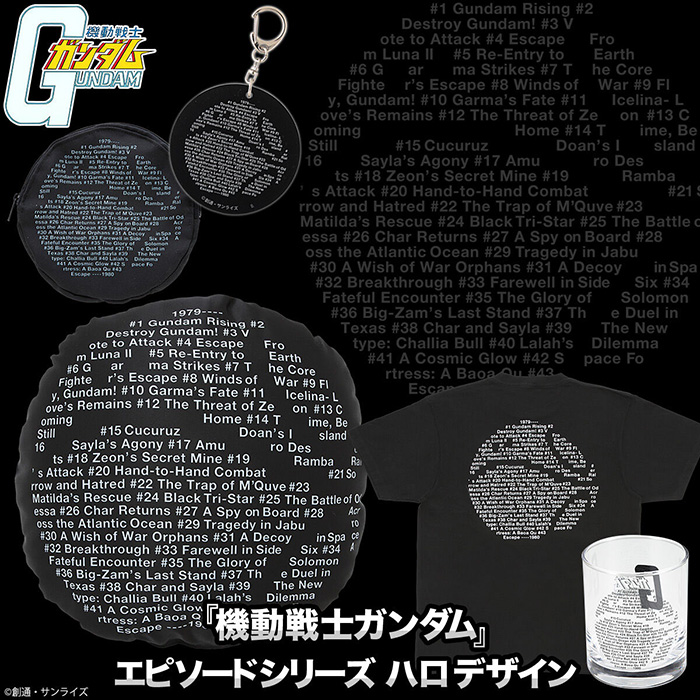 本シリーズは、ハロのシルエットの中に『機動戦士ガンダム』各話の英字タイトルを落とし込んだデザインを使用。「Tシャツ」と「クッション」、「丸型ポーチ」、「グラス」、「アクリルチャーム」の全6種が展開される。