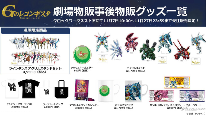 クロックワークスストアにて実施中の劇場版『Gのレコンギスタ』第4部「激闘に叫ぶ愛」と第5部「死線を越えて」の劇場物販事後販売は、11月27日(日)23:59で受付終了となる。