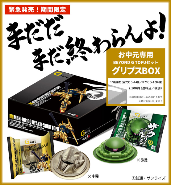 「お中元専用 BEYOND G TOFU セット グリプスBOX」は、お中元セット限定デザインのBOXに「百式とうふ」4機、「ザクとうふ改」6機の10機がセットとなっている。注文は、相模屋の通販サイト「相模屋おとうふShop」にて7月14日(火)まで受付される。