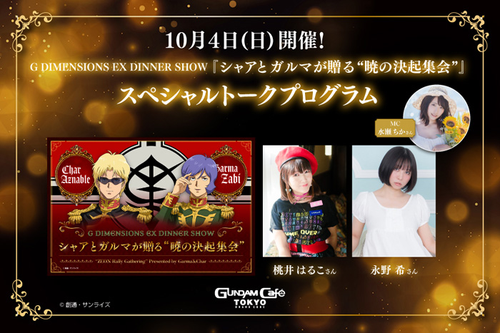 ⇒【9月30日(水)12:00予約開始】10/4開催 G DIMENSIONS EX DINNER SHOW『シャアとガルマが贈る“暁の決起集会”』スペシャルトークプログラム