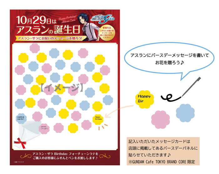 「アスラン・ザラ Birthdayフォーチューンラテ」を購入すると、渡される”メッセージカード”にお祝いのメッセージを記入して、「fortuneLatte Cafe」の店頭に掲示しているBirthdayパネルに飾ろう。実施期間は10月29日(木)まで。
