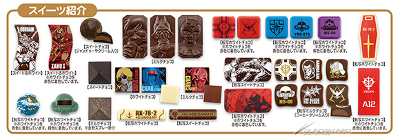 「ガンダムミニギフト」をはじめ、「シャアチョコセット」、「一年戦争チョコギフト」、「赤い彗星シャア専用チョコ缶」、「シャアVSガンダムチョコギフト」、「黒い三連星チョコ缶」、「青い巨星ランバ・ラルチョコ缶」、「ガンダムレリーフ缶」の全8種で展開。スイートチョコやホワイトチョコ、ミルクチョコをベースに、エンブレムやキャラクター、モビルスーツが転写されたものなど、多様なデザインのチョコが詰め合わされている。