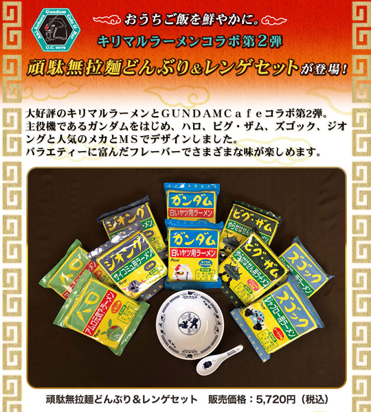 本アイテムは、大好評の「キリマルラーメン」とガンダムカフェによるコラボ第二弾で、ラーメン5種・各2袋に加え、どんぶりとレンゲがセットとなっている。