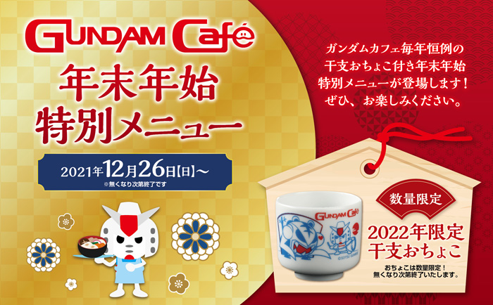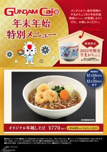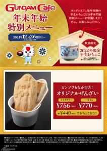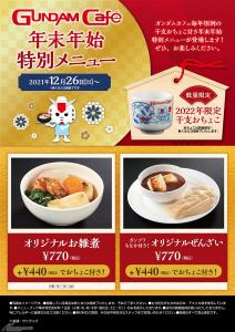 「年末年始特別メニュー」は、「オリジナルぜんざい(ガンプラもなか付き)」が登場。ガンダムカフェTOKYOには「オリジナル年越しそば」と「オリジナルお雑煮」も提供される。