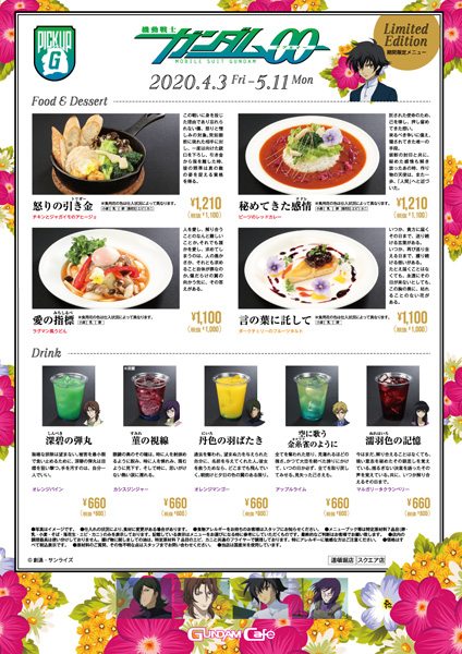 「『ガンダム00』期間限定メニュー」は、フードメニュー3品、デザートメニュー1品、ドリンクメニュー5品がラインナップ。それぞれ『ガンダム00』の世界観やキャラクターをイメージした一品となっている。提供期間は、5月11日(月)まで。
