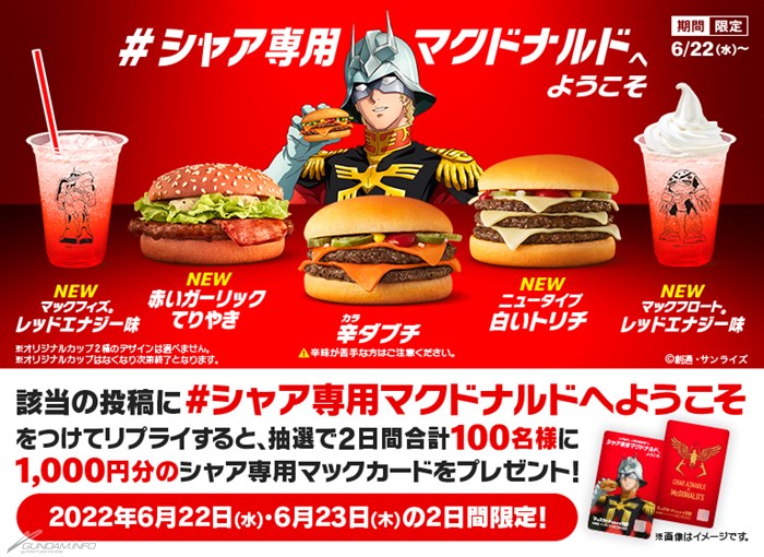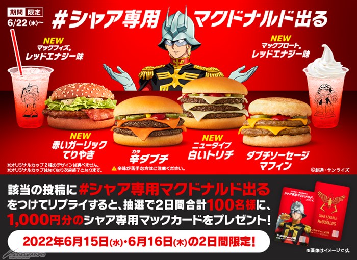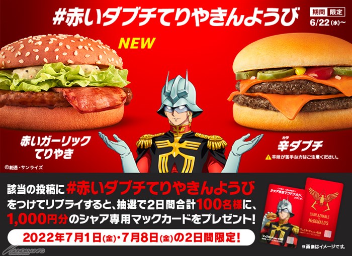 内容:マクドナルド公式Twitterアカウント(@McDonaldsJapan)をフォローし、同アカウントから投稿された「#赤いダブチてりやきんようび」のハッシュタグが付いたツイートに「#シャア専用マクドナルドへようこそ」を付けてリプライしよう。