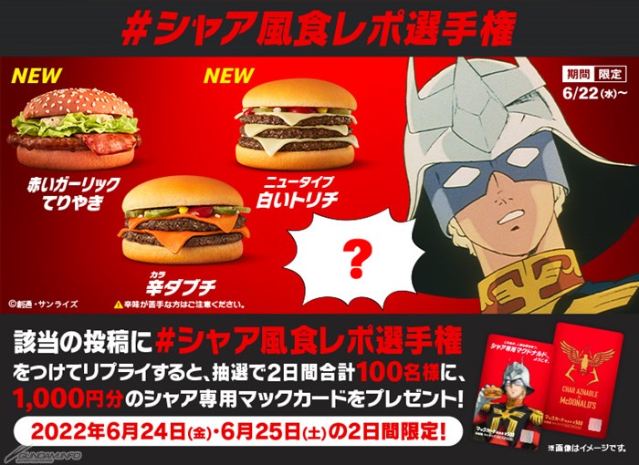 内容:マクドナルド公式Twitterアカウント(@McDonaldsJapan)をフォローし、同アカウントから投稿された「#シャア風食レポ選手権」のハッシュタグが付いたツイートに「#シャア専用マクドナルドへようこそ」を付けてリプライしよう。